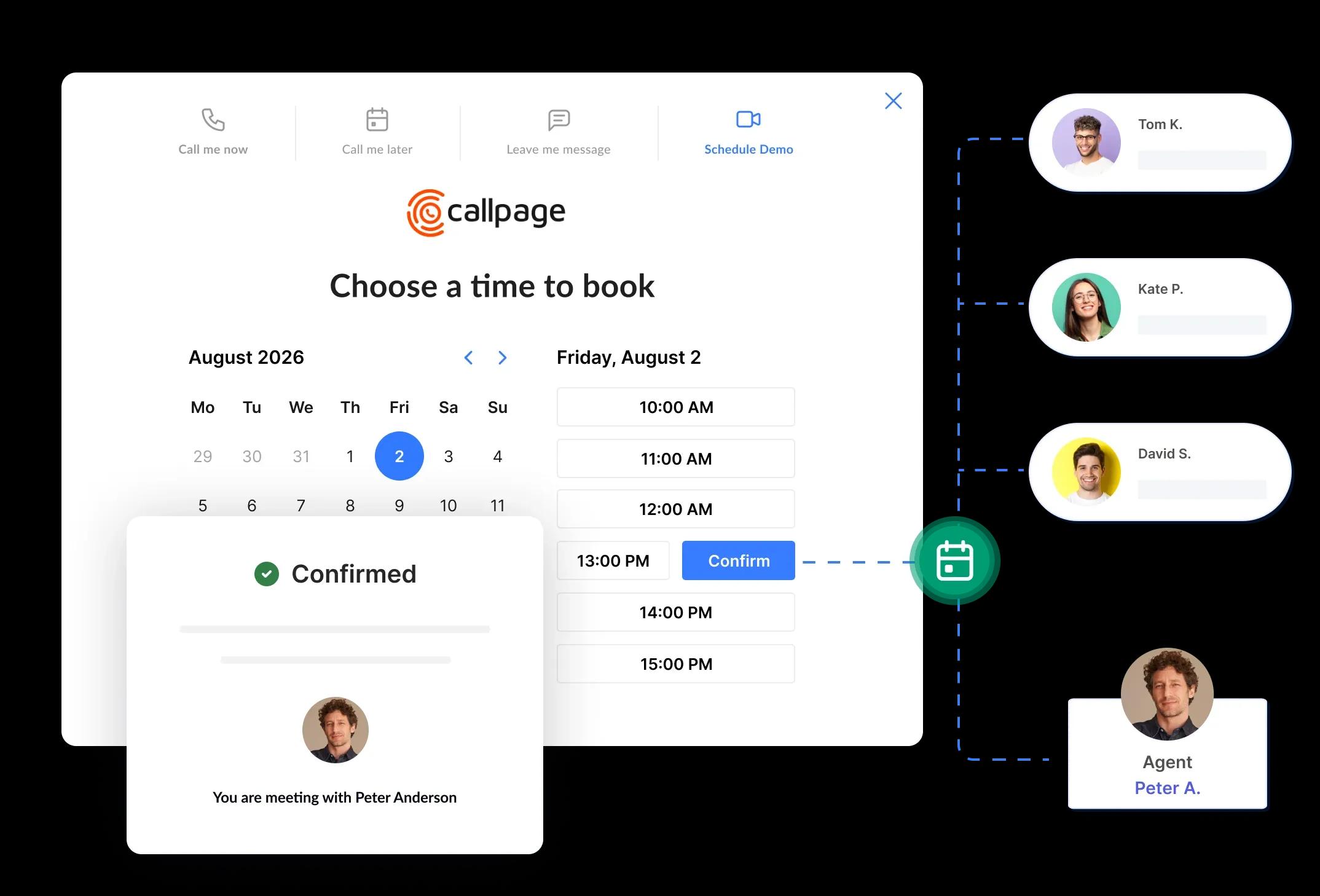 Yes. CallPage includes built-in meeting scheduling — no extra tools required. Customers can book meetings directly from the widget, form, or a shared link, while the system automatically checks calendar availability, create meetings and sends confirmations.