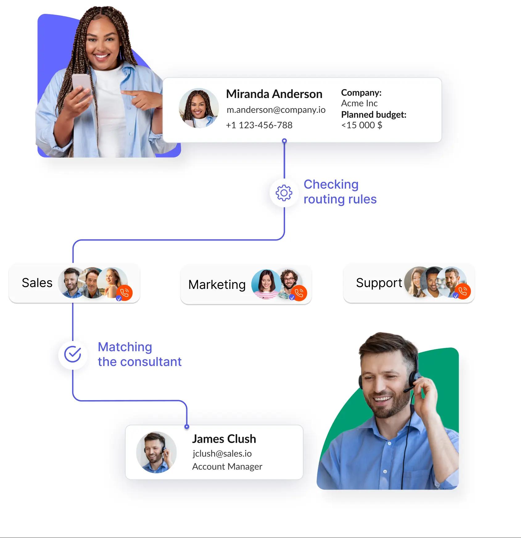 Based on the answers people give in the meeting scheduler pop-up, CallPage directs them to the most appropriate member of your team. Easily edit the rules and add team members as your team grows.