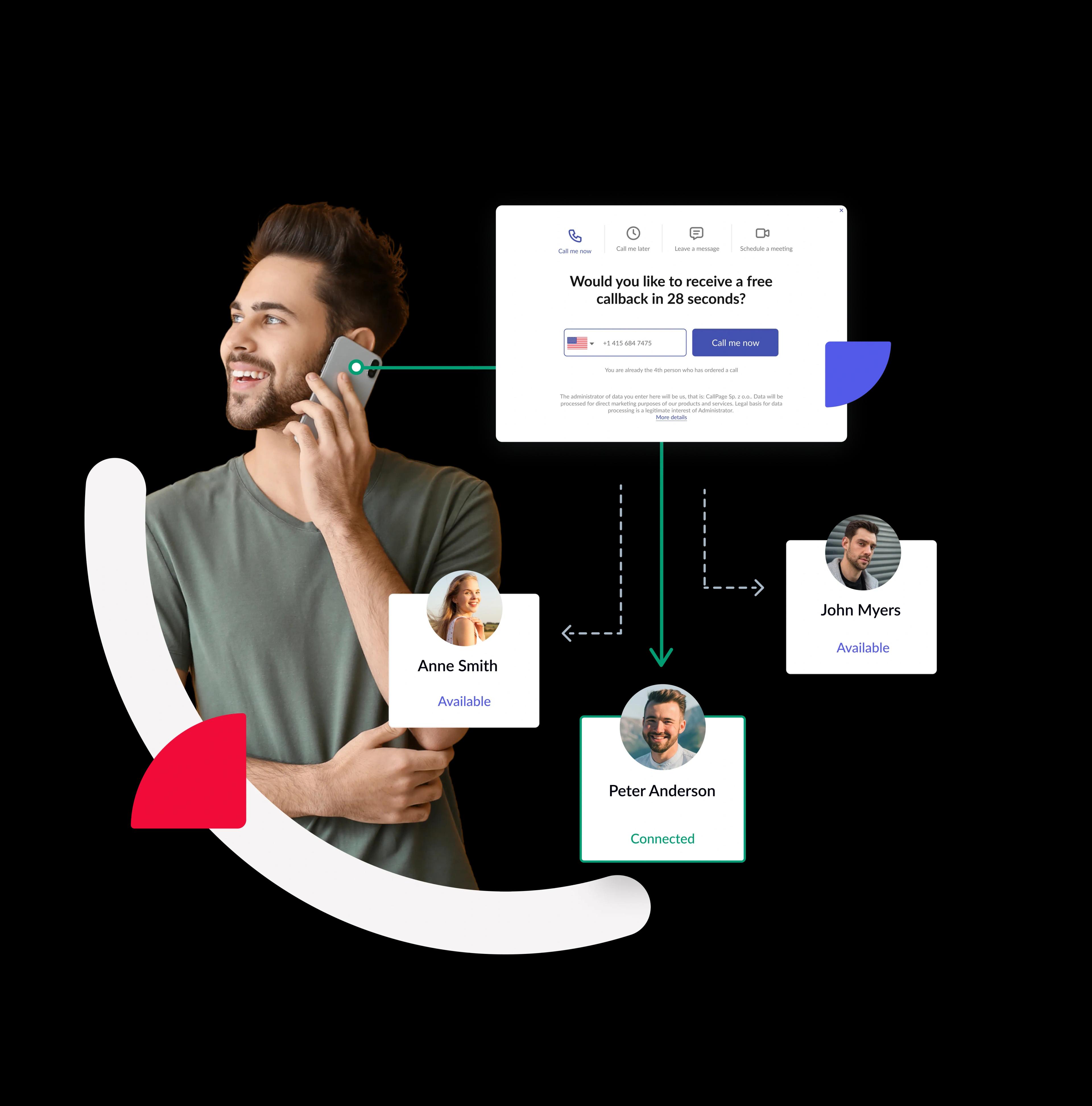 Callback forms help you convert visitors into potential clients. When someone visits your web page, CallPage displays a pop-up that encourages the user to provide their phone number. Thanks to the callback function, you don't have to worry about missed calls. All incoming calls are routed automatically to your sales team within seconds.